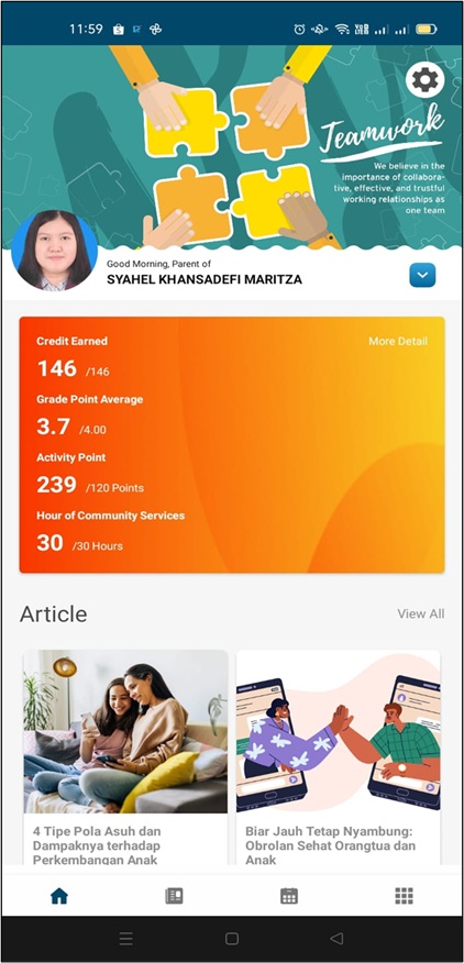 Apabila login berhasil, Orang Tua/Wali Mahasiswa akan diarahkan ke halaman utama aplikasi BINUS Mobile for Parent.