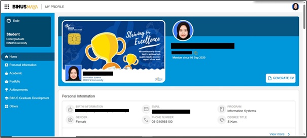 Menu ini berisi data personal mahasiswa yang terintegrasi dengan sistem BINUS.