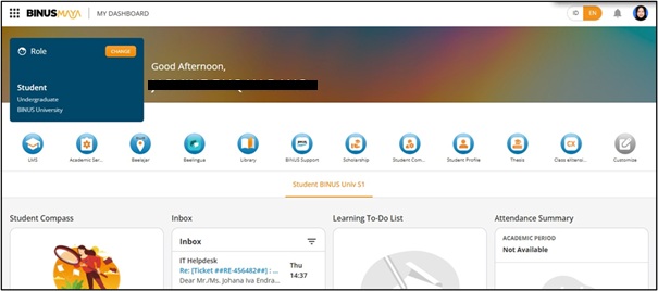 Silakan login ke BINUSMAYA menggunakan akun mahasiswa, kemudian masuk ke halaman My Dashboard.