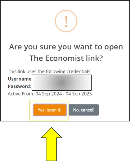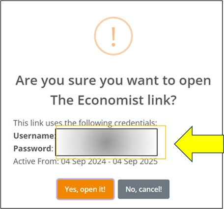 Copy–paste username dan password yang muncul pada pop-up sebelumnya agar dapat masuk ke platform The Economist.