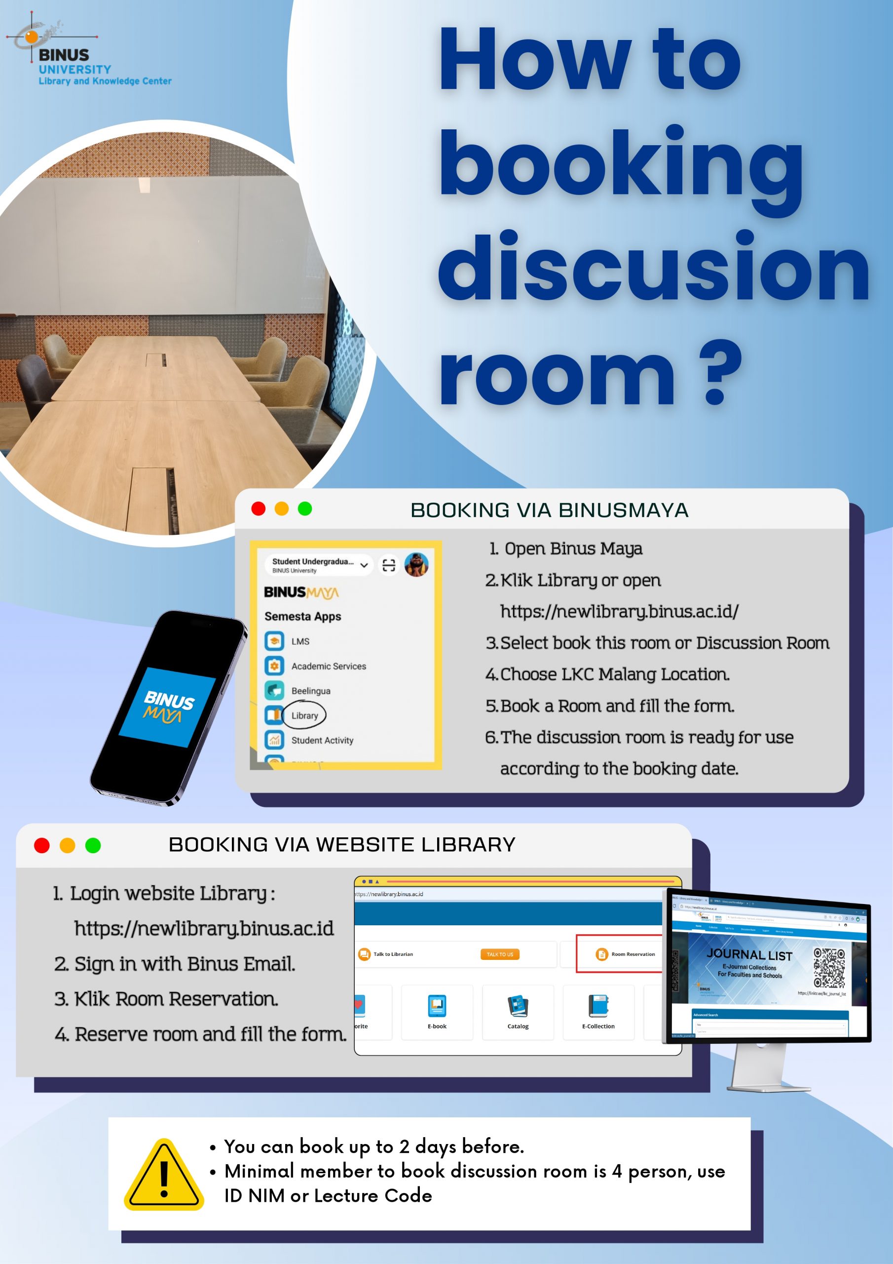 Discussion Room (Ruang Diskusi) merupakan fasilitas yang disediakan BINUS University untuk mendukung kegiatan belajar kelompok mahasiswa. Ruangan ini dapat digunakan untuk diskusi tugas, meeting proyek, atau kegiatan akademik lainnya. Berikut adalah panduan lengkap cara melakukan pemesanan Discussion Room melalui dua metode yang tersedia.
