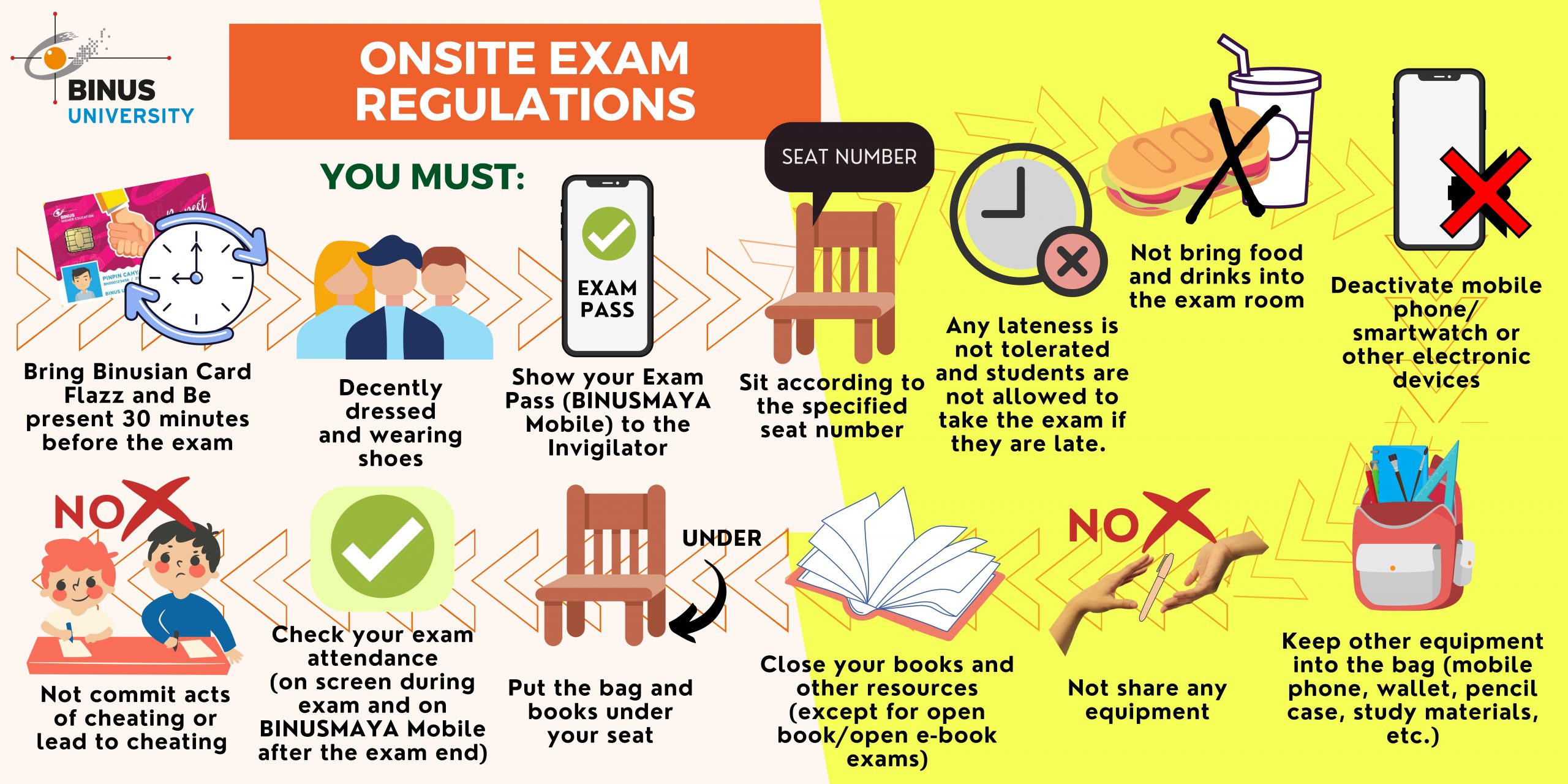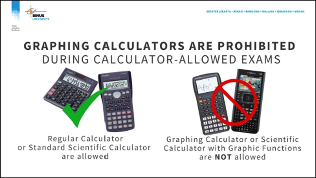 Bawalah BINUSIAN Card atau Flazz Card sebagai identitas resmi selama ujian. Pastikan juga membawa alat tulis yang diperlukan.