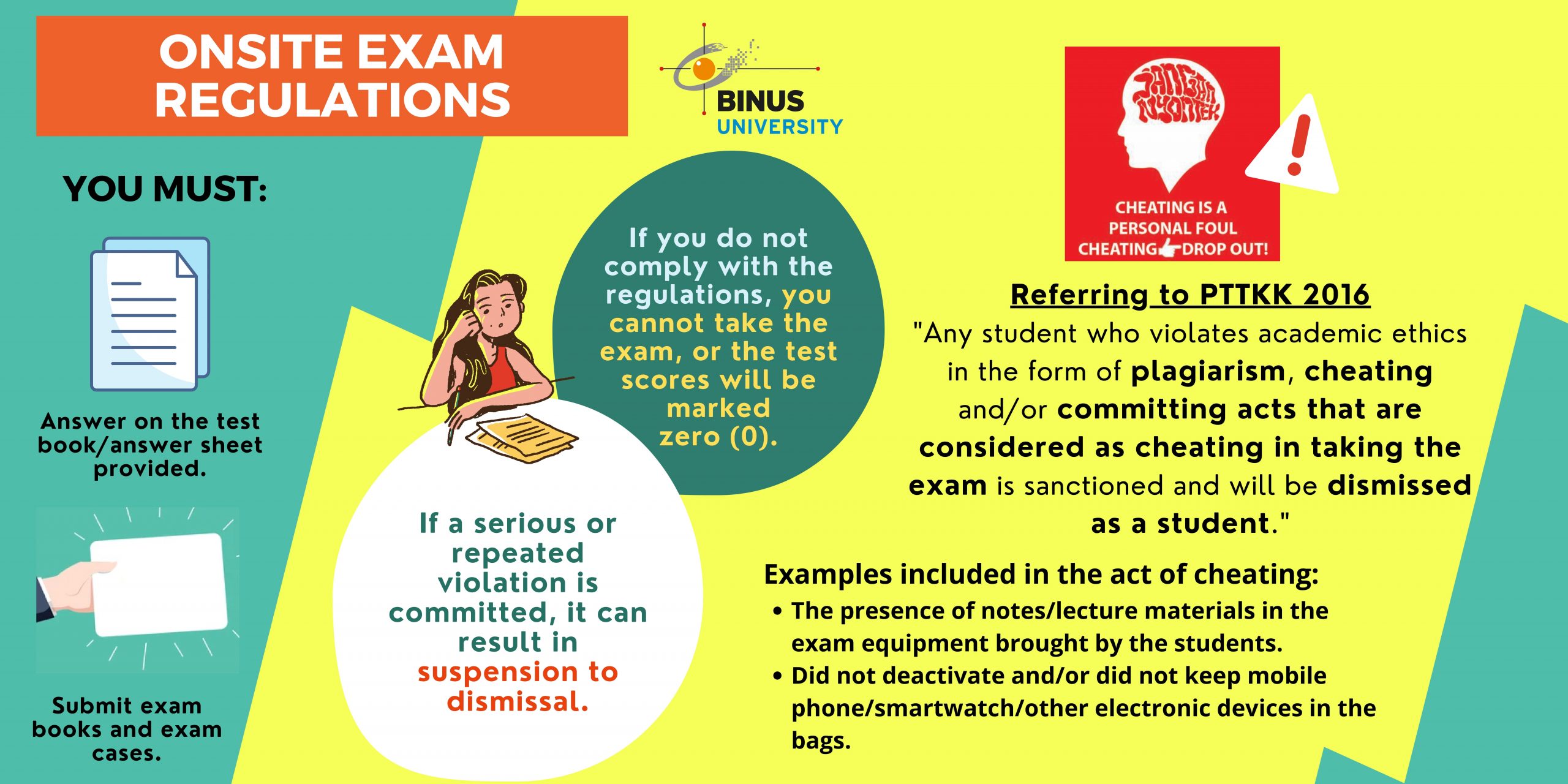 Pelaksanaan ujian onsite di BINUS University diatur dengan ketentuan dan tata tertib yang wajib dipatuhi oleh seluruh mahasiswa. Peraturan ini bertujuan menjamin integritas akademik serta memastikan pelaksanaan ujian berlangsung secara tertib, adil, dan profesional. Pelanggaran terhadap regulasi ujian dapat berakibat pada pembatalan nilai dan penerapan sanksi akademik berat.