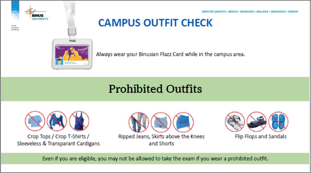 Mahasiswa harus mengenakan pakaian yang layak dan sopan serta sepatu. Penampilan yang tidak sesuai etika akademik dapat menyebabkan penolakan masuk ruang ujian.