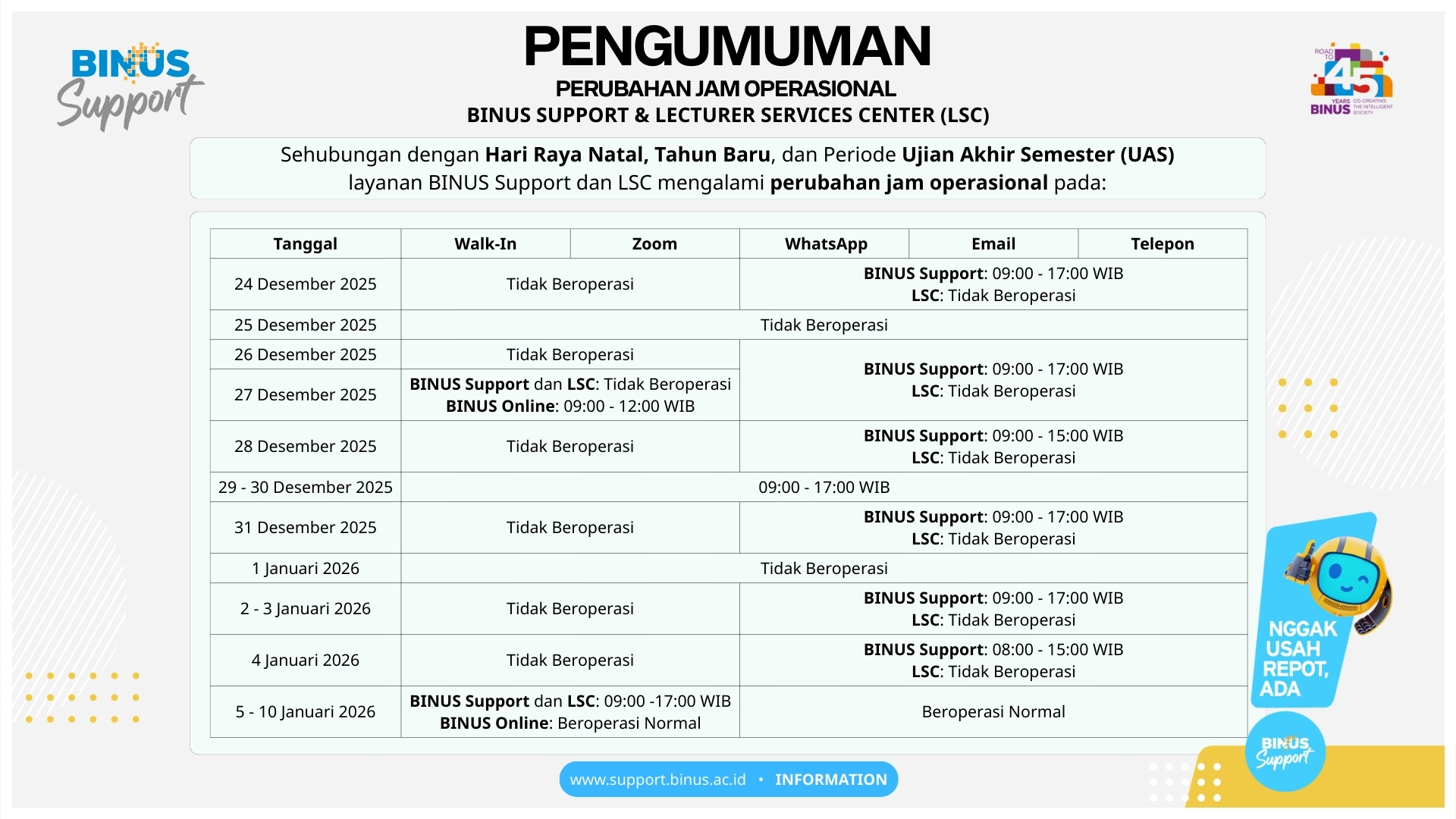 Sehubungan dengan Hari Raya Natal, Tahun Baru, serta Periode Ujian Akhir Semester (UAS), kami informasikan bahwa layanan BINUS Support dan Lecturer Services Center (LSC) akan mengalami perubahan jam operasional pada periode akhir Desember 2025 hingga awal Januari 2026.