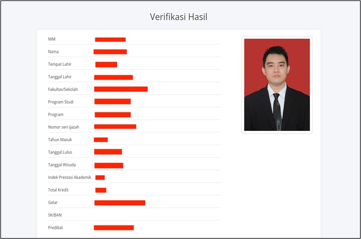 Sistem akan menampilkan hasil verifikasi ijazah sesuai dengan data yang dimasukkan. Informasi ini dapat digunakan sebagai bukti keabsahan dokumen kelulusan alumni.