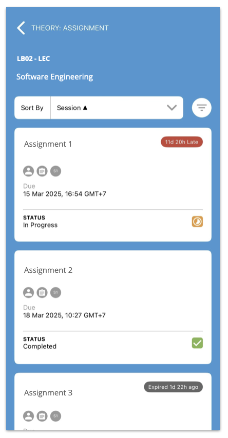 Untuk tugas yang berstatus completed, akan memiliki beberapa kondisi informasi seperti menunggu dinilai oleh dosen (i), sudah dinilai(ii), dan feedback oleh dosen(iii). Pastikan kamu mengecek feedback yang ditinggalkan oleh dosen. Berikut adalah tampilan dari tiap kondisi tersebut: