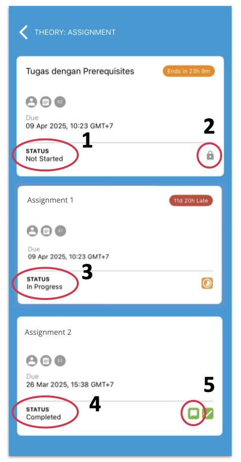 • Completed :Tugasmu sudah selesai dikerjakan, untuk mengecek detail status tugasmu apakah masih menunggu penilaian atau sudah selesai dinilai, pilih salah satu tugas yang ingin kamu cek. (4)