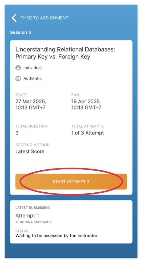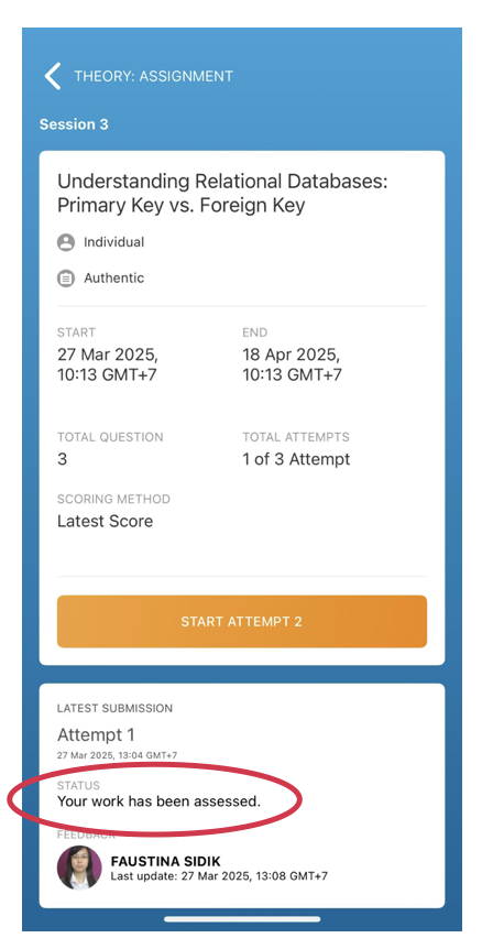 Apakah Anda telah menyelesaikan tugas, namun merasa masih ada jawaban yang dapat disempurnakan? Jangan khawatir, Anda dapat memanfaatkan fitur attempt. Selama periode pengerjaan tugas masih berlangsung, Anda tetap memiliki kesempatan untuk memperbaiki jawaban Anda.