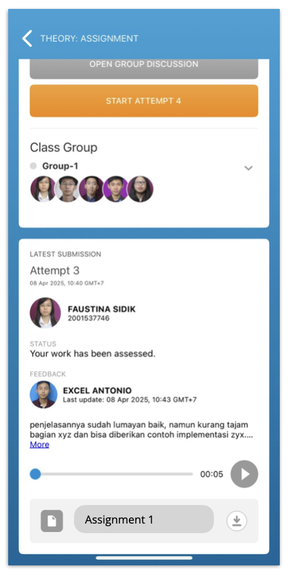 (iii) Tampilan saat tugasmu sudah dinilai dan diberikan feedback oleh dosen. Tampilan dapat berbentuk teks maupun audio. Pada teks yang cukup panjang, klik pada “More” untuk melihat feedback seutuhnya.