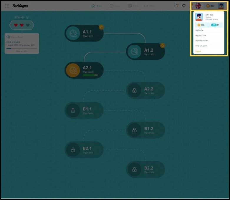 Setelah masuk ke Beelingua, kamu akan mendapatkan tutorial singkat tentang halaman Home. Pada halaman ini, kamu bisa menemukan beberapa menu utama, yaitu:
