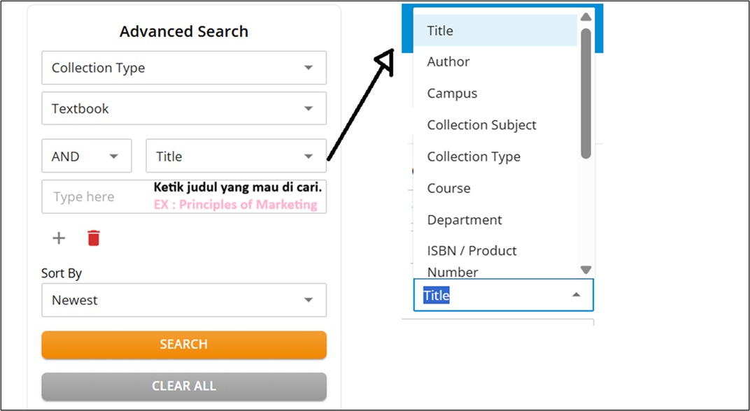 Pilih jenis pencarian pada menu Search By (misalnya: Title, Author, dan lainnya).