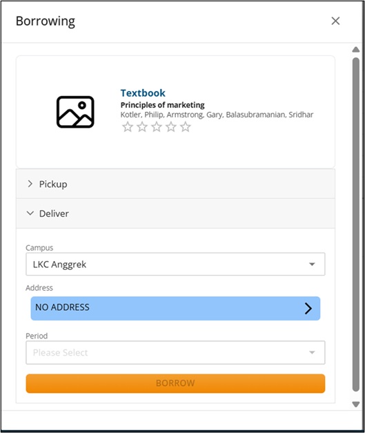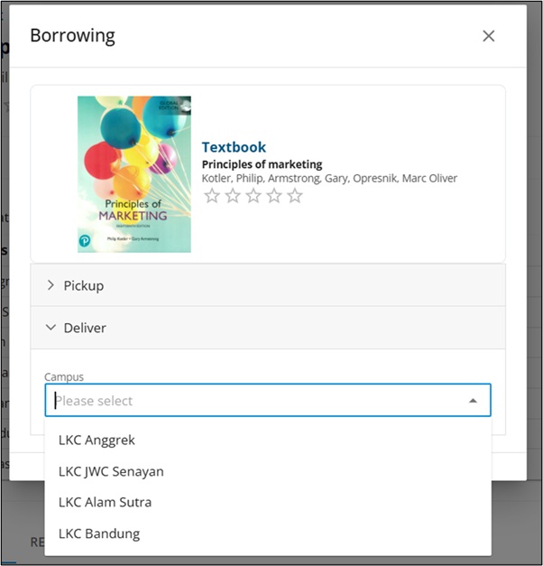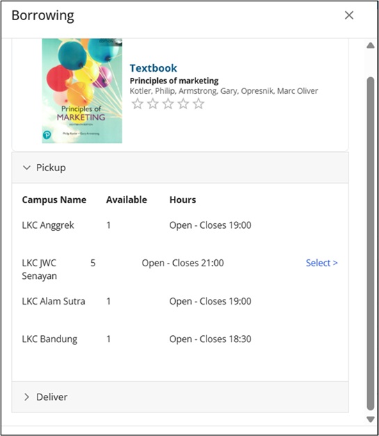 Saat memilih layanan Deliver, akan muncul daftar lokasi kampus yang menyimpan ketersediaan buku tersebut.