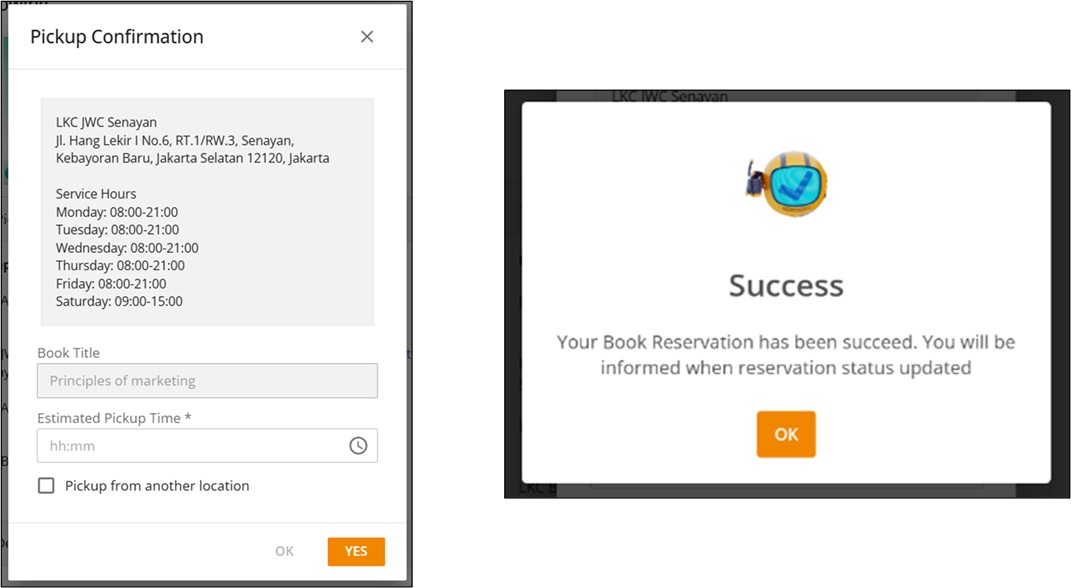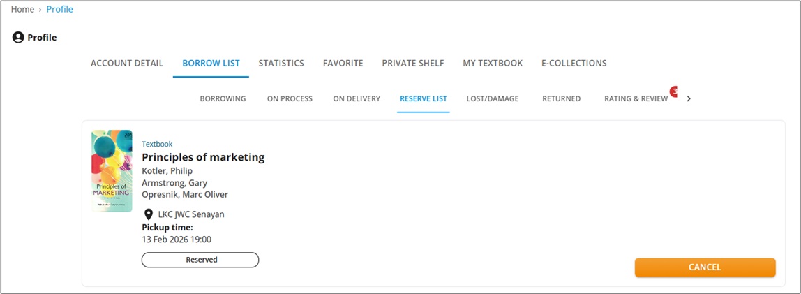 Ketika pop-up Success ditampilkan, pilih OK. Anda akan langsung diarahkan ke Borrow List untuk meninjau detail buku yang telah di-reserve.