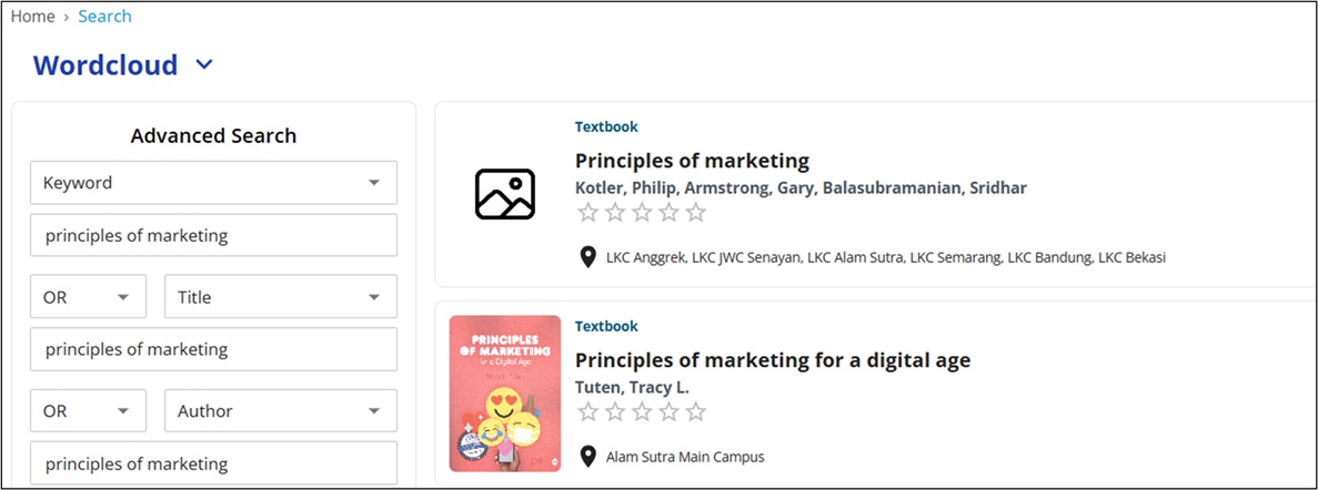 Setelah tombol Search diklik, sistem akan menampilkan beberapa judul buku yang relevan dengan kata kunci yang dimasukkan.
