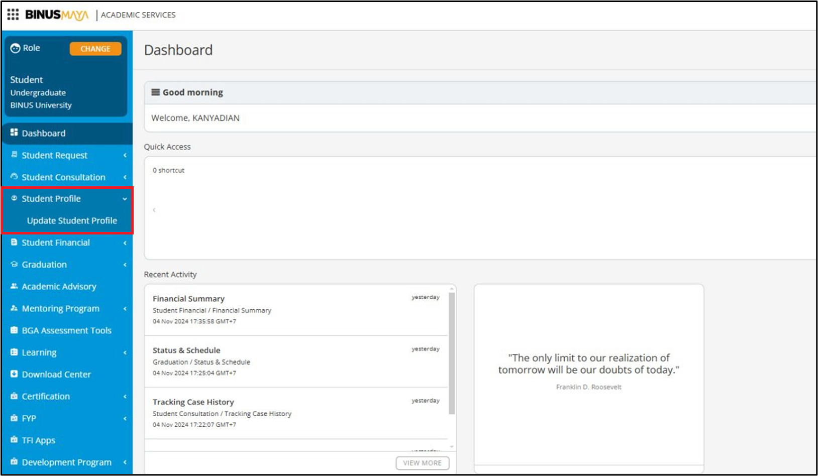 - Lalu, pilih submenu Update Student Profile untuk mulai memperbarui informasi data diri.