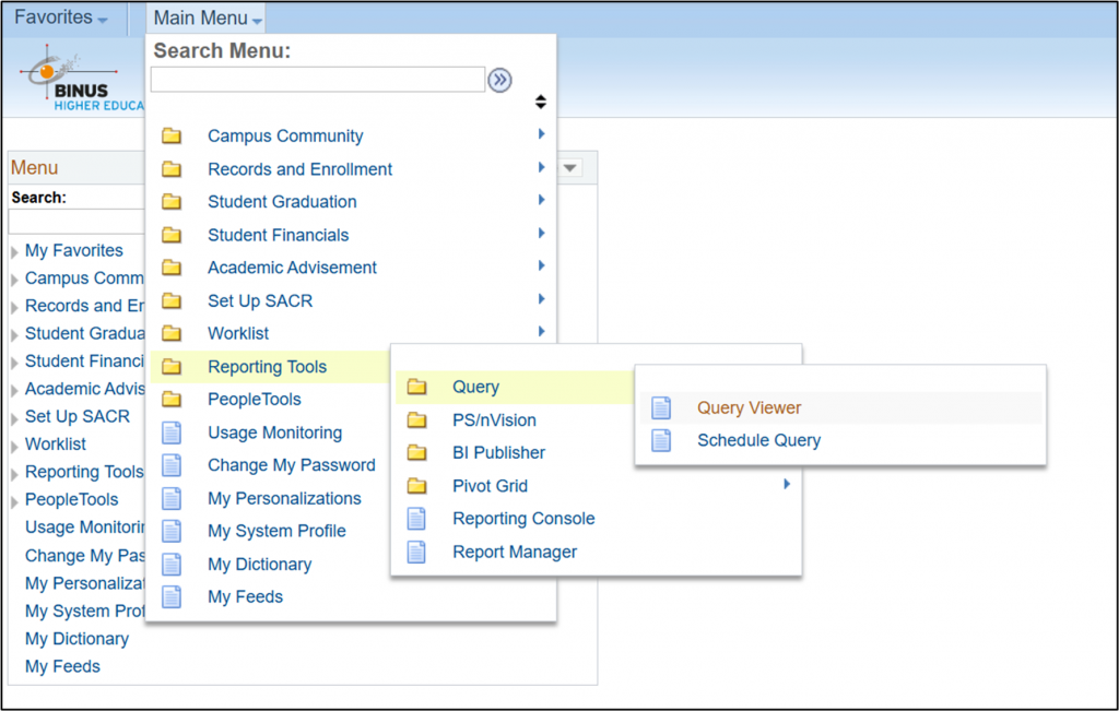 - Main Menu, pilih Reporting Tools, pilih Query, pilih Query Viewer